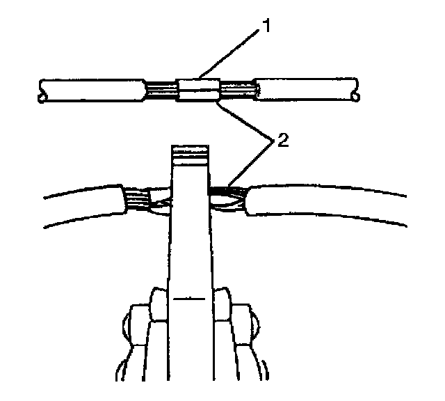 7. Center the splice clip (2) over the stripped wires (1) and hold the clip in place.