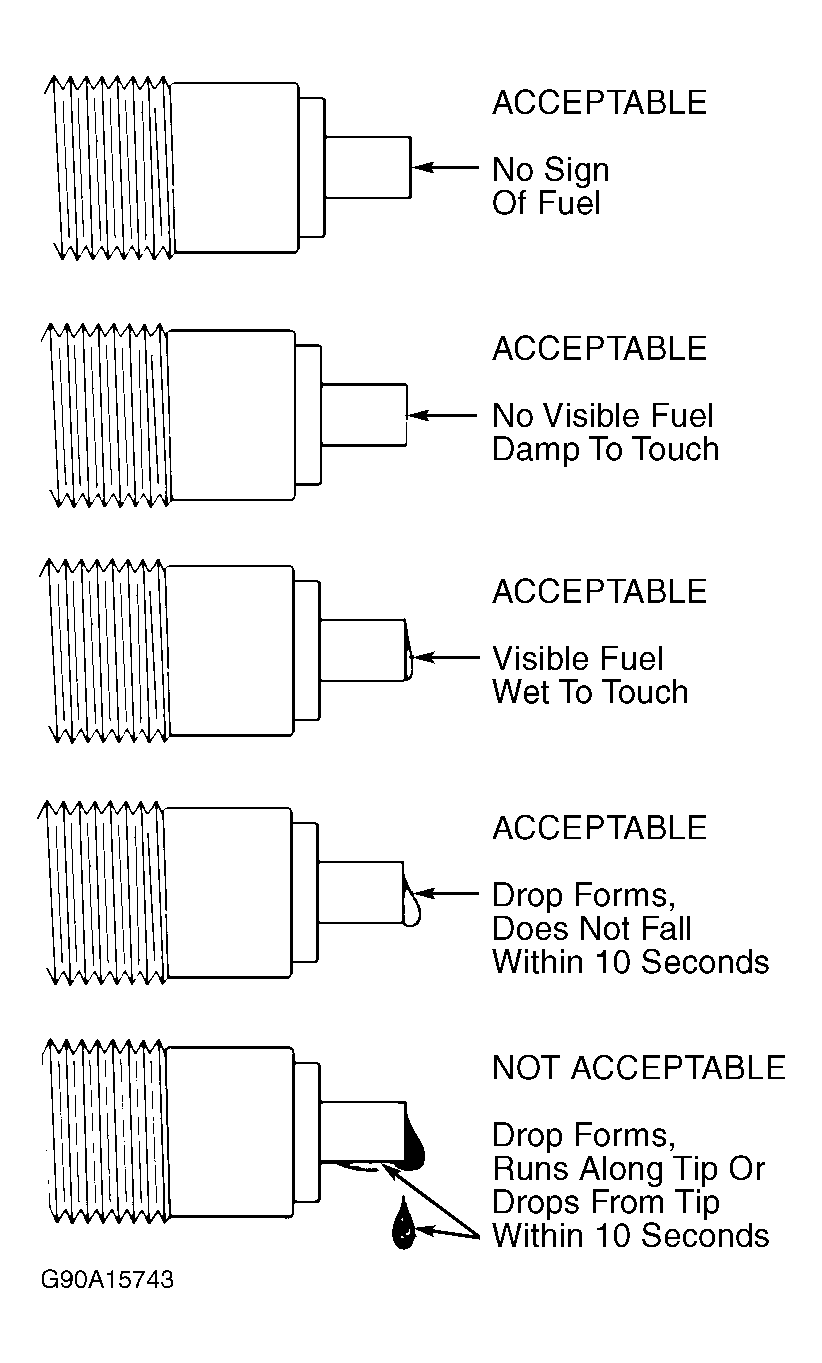 2. A drop may form on end of injector nozzle, but should not fall off within a 10 second period. Replace injector nozzle if a drop of test fluid falls from tip during 10 second period. See Fig 1. Release tester pressure.