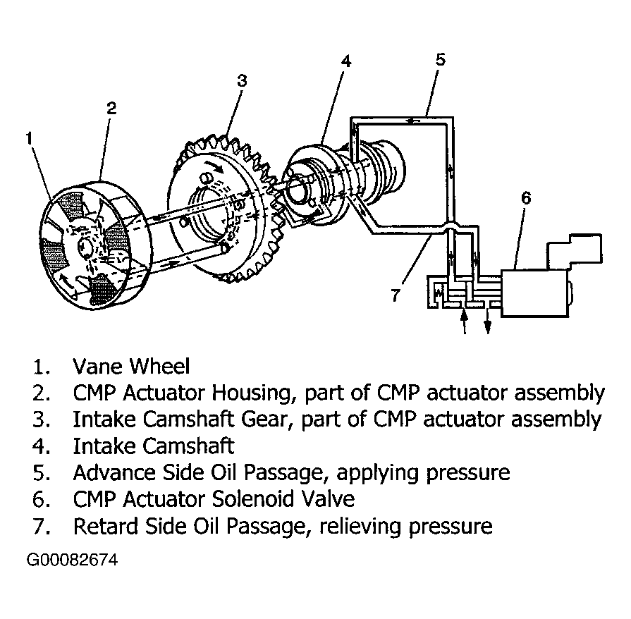 Oil flowing to the CMP actuator housing from the CMP solenoid advance passage applies pressure to the advance side of the vane wheel in the CMP actuator assembly. See Fig 1 . At the same time the CMP solenoid retard passage is open, allowing oil pressure to decrease on the retard side of the vane wheel. These two simultaneous actions cause the vane wheel to rotate clockwise, advancing camshaft advance timing.