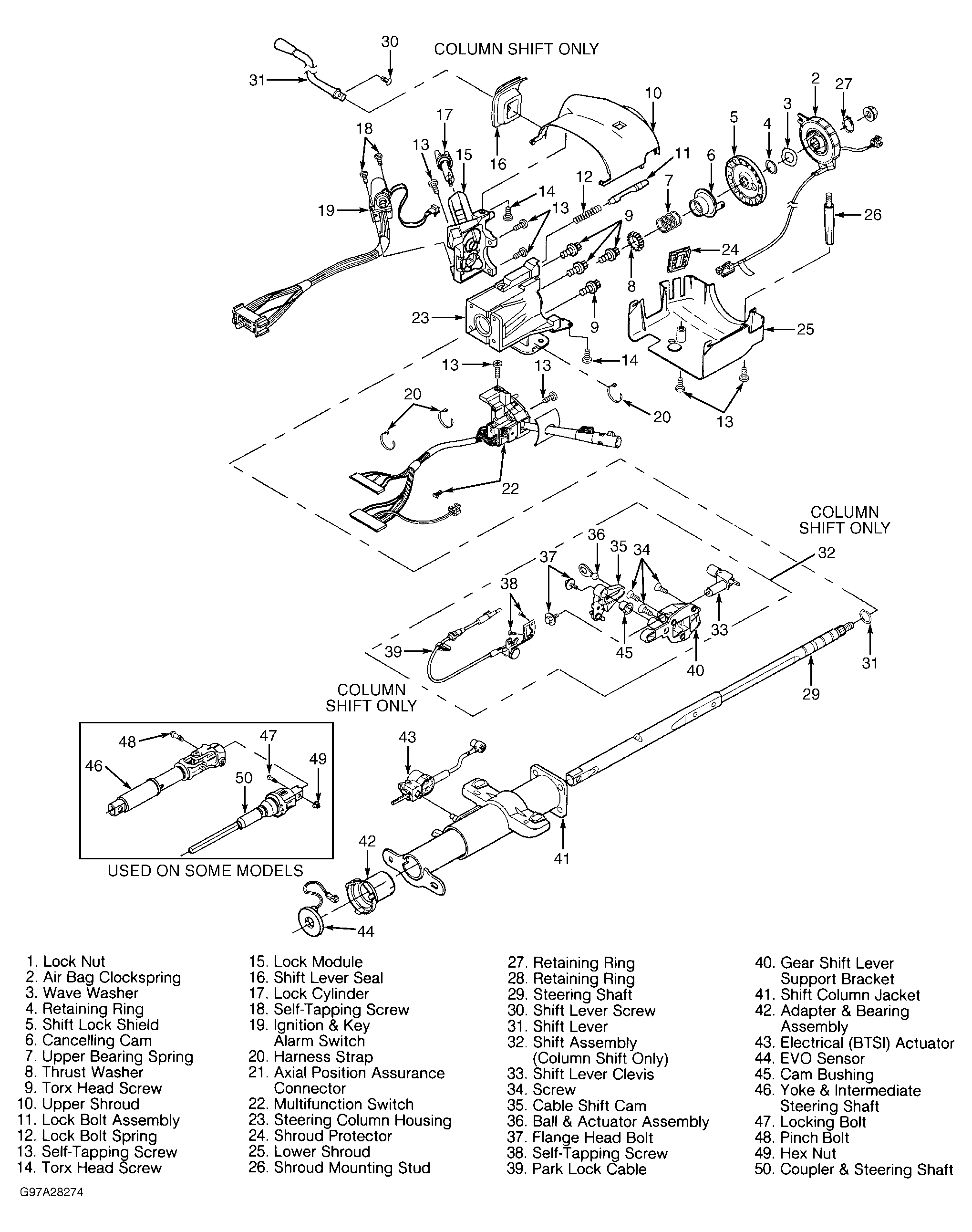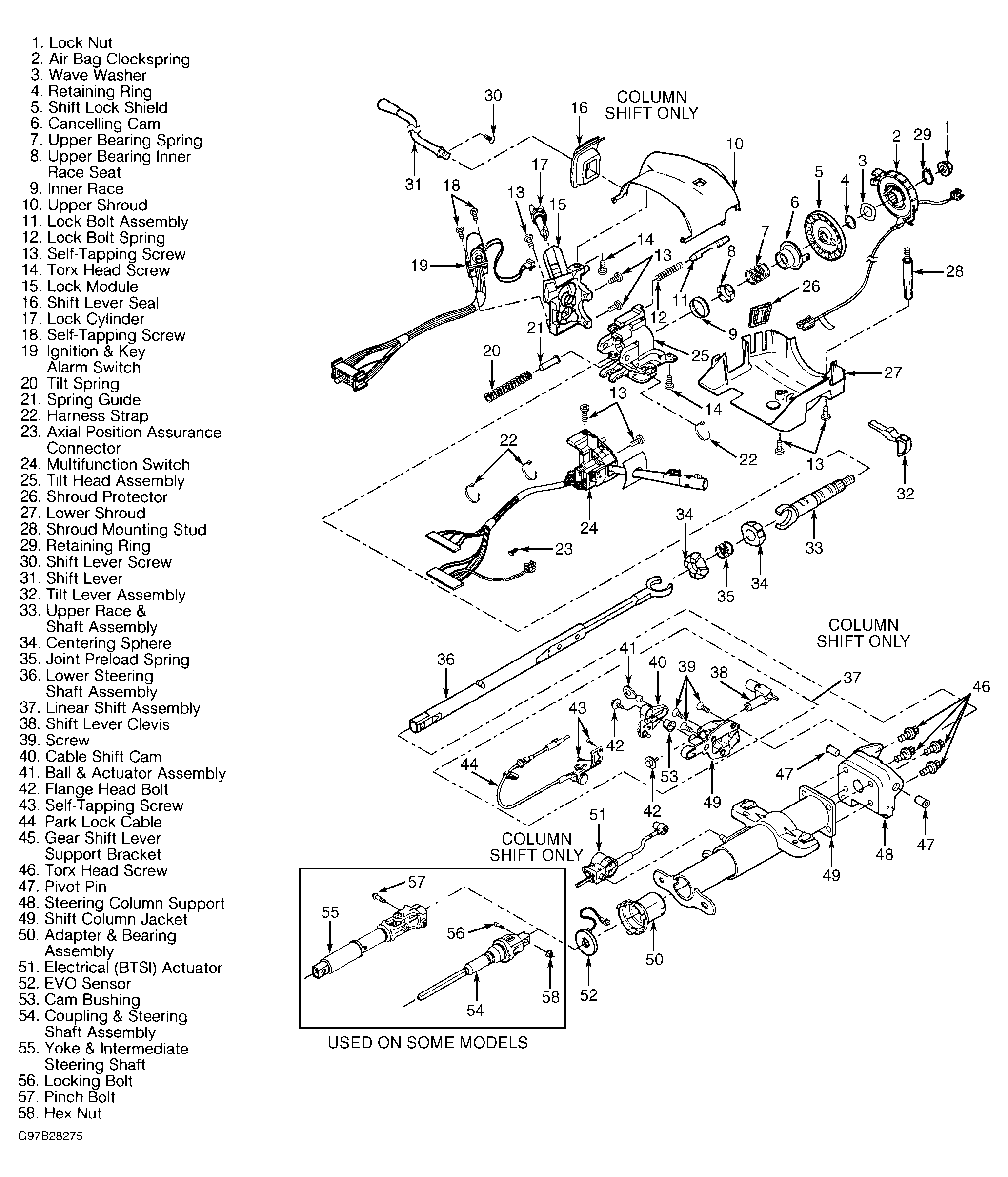 Use illustrations for exploded view of steering columns. See