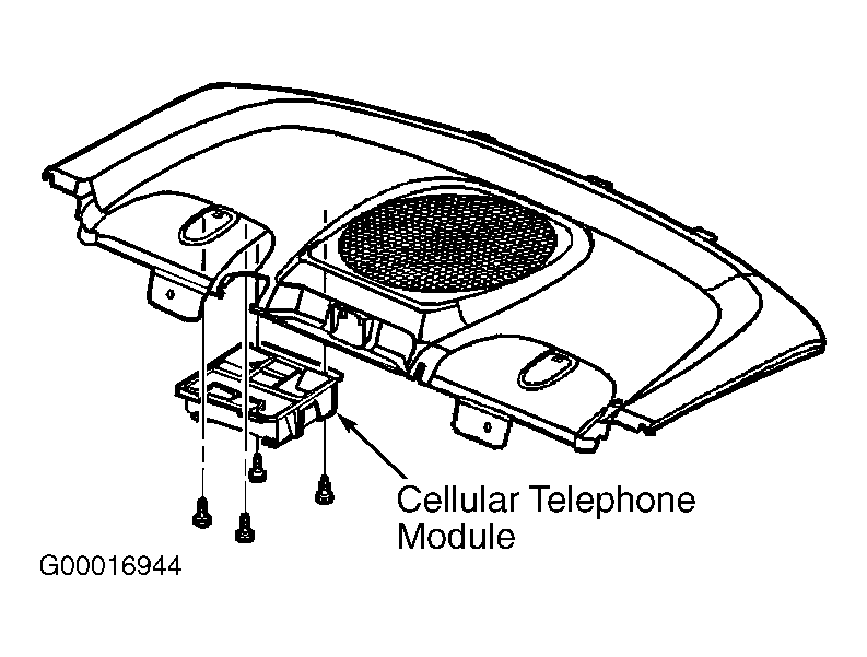 Remove rear compartment trim panel. See REAR COMPARTMENT TRIM PANEL  . Disconnect electrical connector from cellular telephone module. Remove 4 screws retaining cellular telephone module and bracket assembly to rear shelf trim panel. See Figure . Remove cellular telephone module and mounting bracket assembly from rear shelf trim panel. Release cellular telephone module mounting bracket retaining tabs and slide module out of mounting bracket. To install, reverse removal procedure.