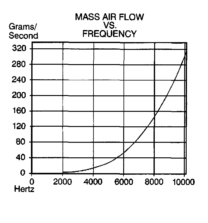 The Mass Air Flow (MAF) sensor measures the amount of air flow into the engine in a given time. The MAF sensor produces a signal as air passes through the sensor and into the engine. The amount of air flow determines the frequency of the signal. If the air flow through the sensor increases, the frequency of the signal will increase. If the air flow through the sensor decreases, the frequency of the signal will decrease. Normally, the frequency will vary from approximately 2000 hertz at idle to about 10,000 hertz at maximum engine load. The PCM uses the MAF sensor information to provide the correct fuel delivery for all engine operating conditions.
