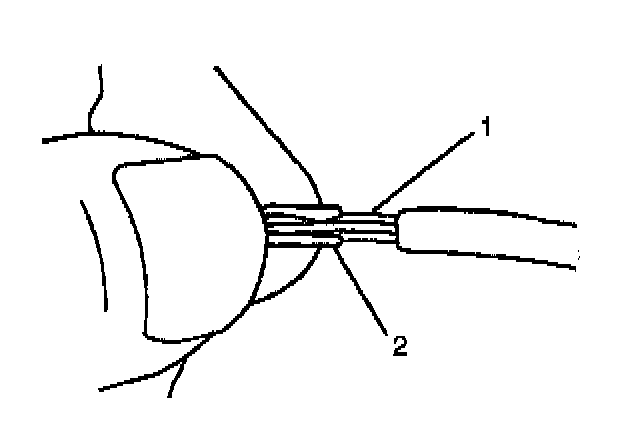 7. Center the splice clip (2) over the stripped wires (1) and hold the clip in place.
