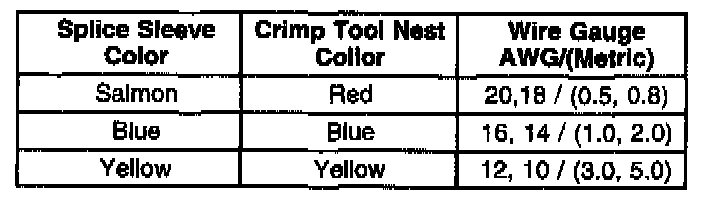 Use crimp and seal splice sleeves to form a one-to-one splice on all types of insulation except tefzel and coaxial to form a one-to-one splice. Use tefzel and coaxial where there is special requirements such as moisture sealing. Follow the instructions below in order to splice copper wire using crimp and seal splice sleeves.Crimp And Seal Splice Table:
