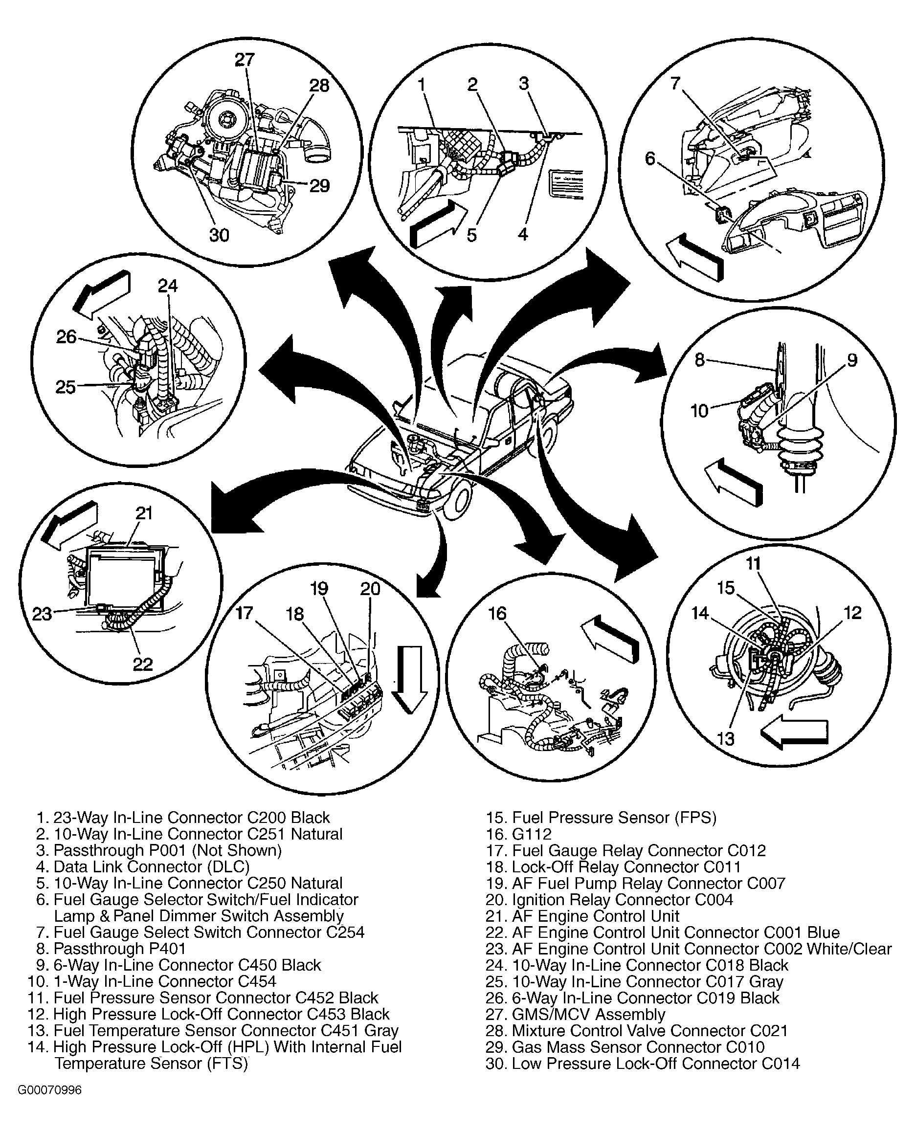 14. Check for open in Pink wire between AF ECU and PCM connector C1 terminal No. 71. See Figure. Check for poor connections ate PCM. Check that PCM is calibrated with proper bi-fuel information. Repair circuit connections or program PCM as necessary. After repairs, go to step  22. If no problems are found, go to step  17.