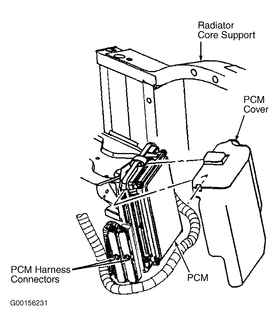 1. Ensure ignition is off. Disconnect negative battery cable. Locate PCM at left front corner of engine compartment. See Fig 1. Release PCM cover from mounting tabs on PCM bracket.