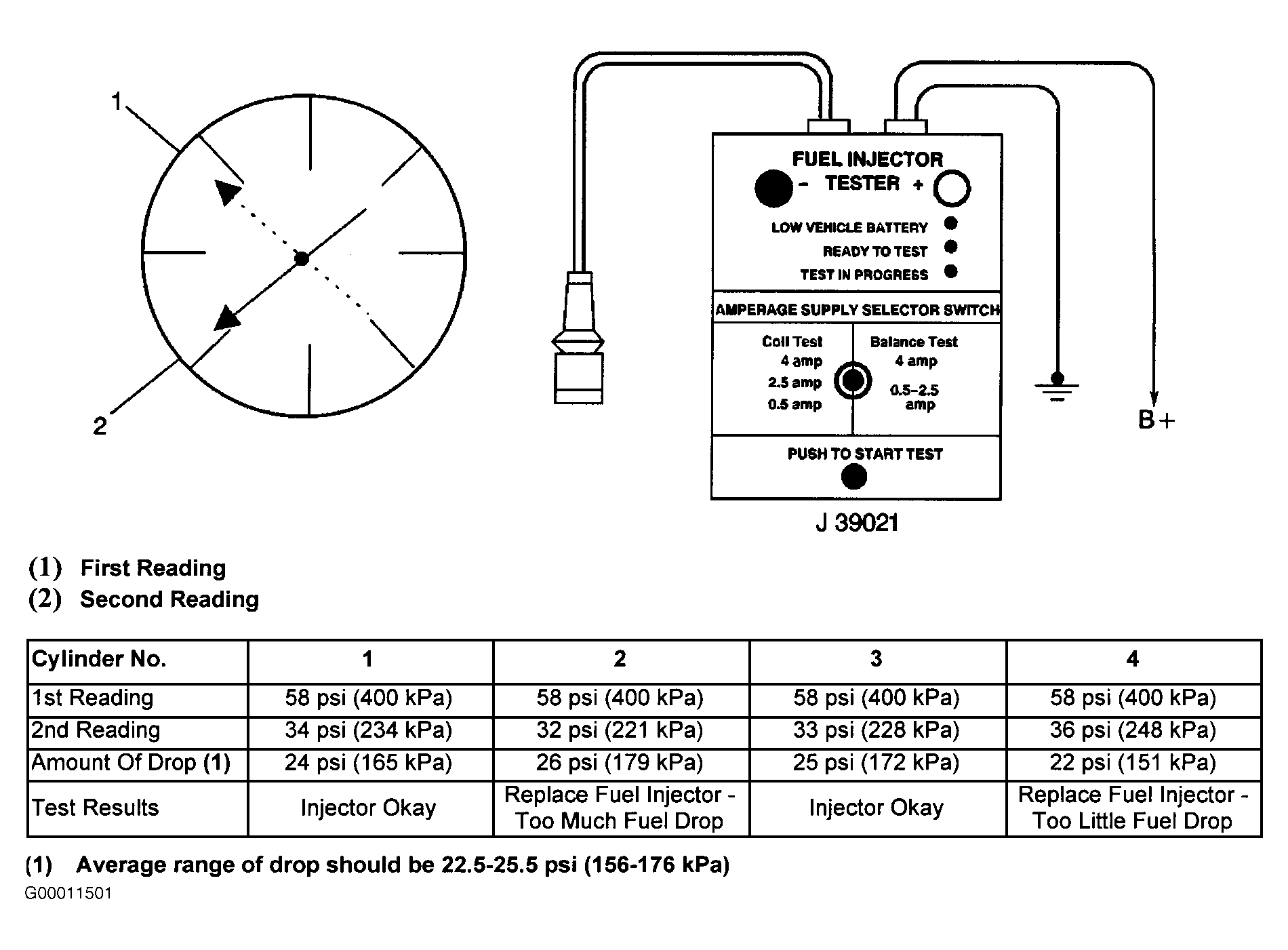 If pressure drop value for each fuel injector is within 1.5 psi (10 kPa) of average pressure drop value, fuel injectors are flowing properly. Calculate pressure drop value for each fuel injector by subtracting second pressure reading from first pressure reading. See Figure.
