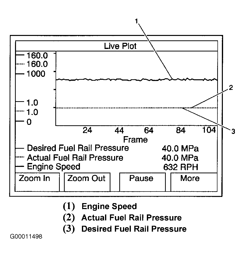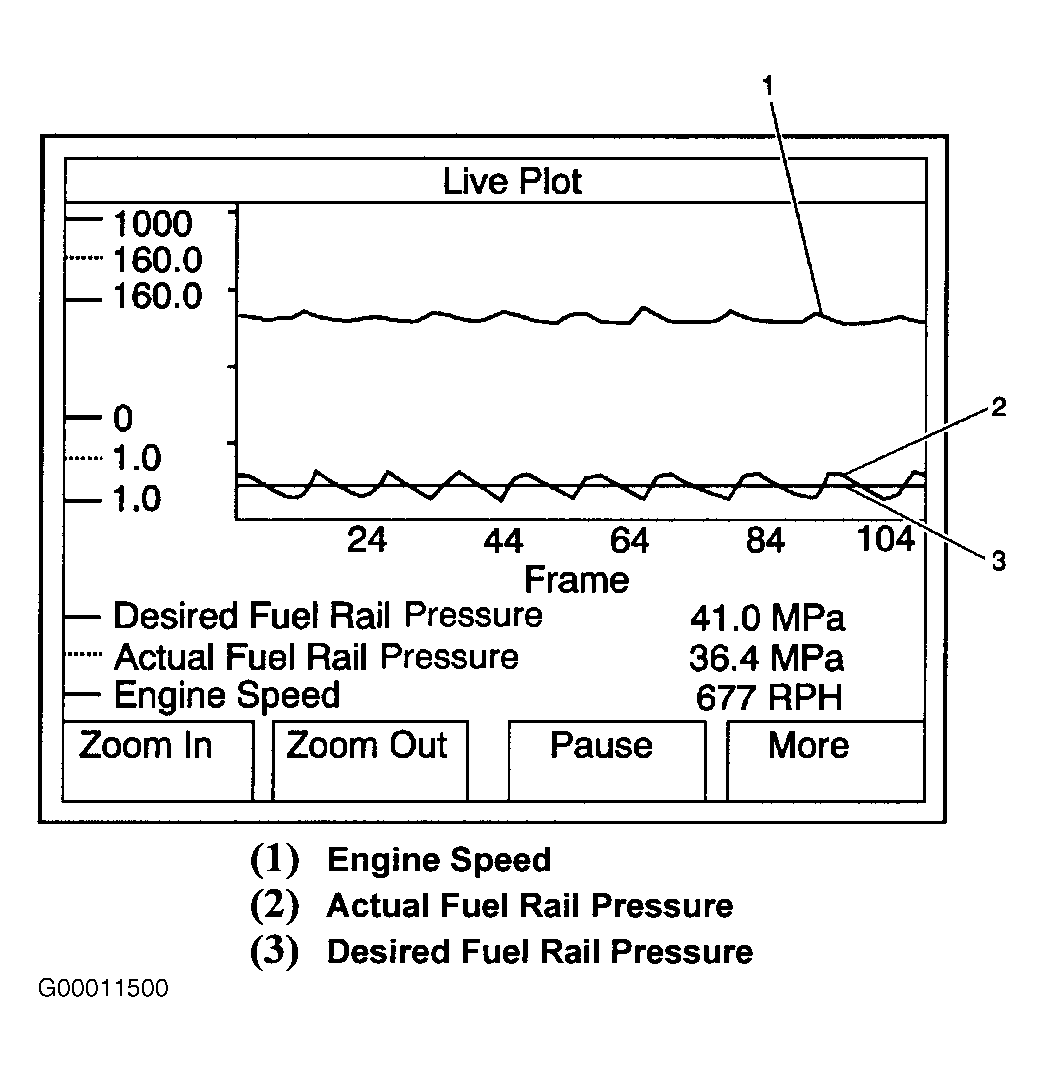 - Select Engine Speed, Actual Fuel Rail Pressure, and Desired Fuel Rail Pressure parameters by highlighting each parameter and depressing ENTER softkey.