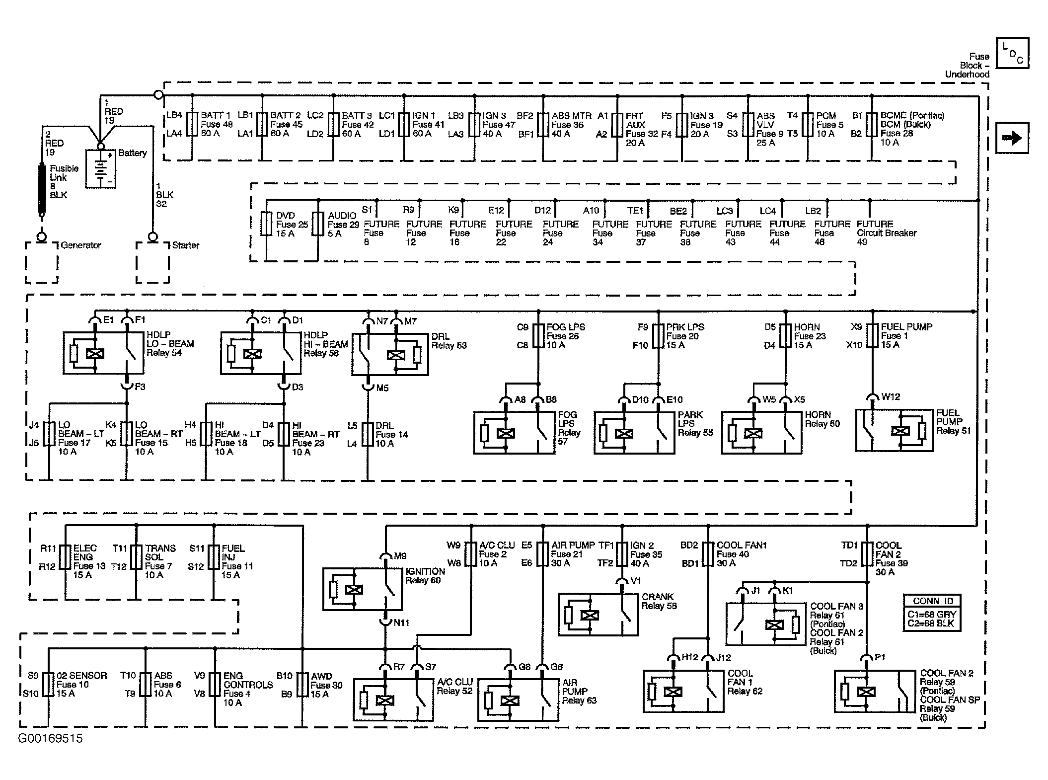 The closed relay contacts allow current to flow from the battery to the ENG CONTROLS fuse, Fuel INJ fuse, ELEC ENG fuse, O2 Sensors fuse, TRANS SOL fuse, ABS fuse and AWD fuse. Fuses are located in underhood fuse/relay block. See Fig 1 .