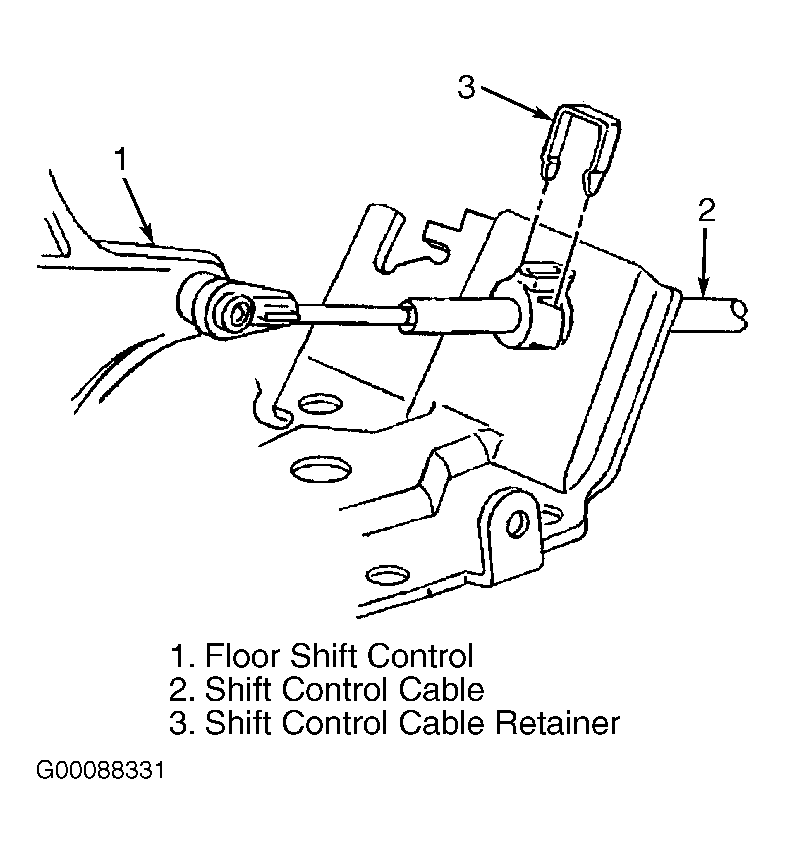 - Pull the cable locking clip fully upward at the floor shift control. See Figure.