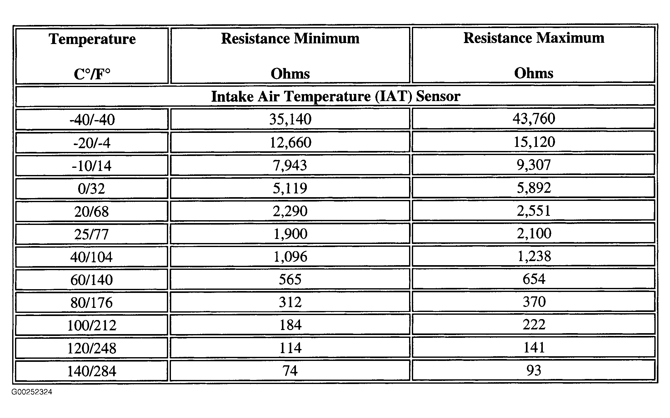 . Resistance should be high when air temperature is cold and drop as air temperature warms. With vehicle sitting overnight, ECT sensor and IAT sensor should have close to the same resistance reading. If resistance is not within specification, replace IAT sensor. See INTAKE AIR TEMPERATURE SENSOR