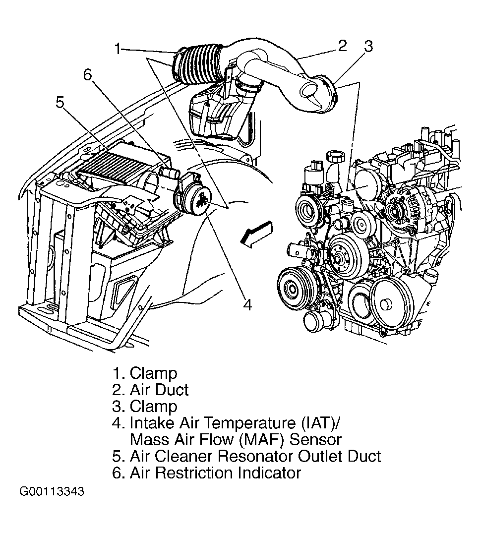 The Intake Air Temperature (IAT) sensor is a variable resistor. IAT sensor is located in fresh air intake tube. See Fig 1. The IAT sensor has a signal and a low reference circuit. The IAT sensor measures the temperature of the air entering the engine. The PCM supplies 5 volts to the IAT signal circuit and a ground for the IAT low reference circuit. When IAT sensor is cold, the sensor resistance is high. When air temperature increases, the sensor resistance decreases. With high sensor resistance, PCM detects a high voltage on the IAT signal circuit. With lower sensor resistance, PCM detects a lower voltage on the IAT signal circuit. Failure in IAT sensor circuit should set a related DTC. To diagnose, perform related diagnostic test. See DIAGNOSTIC TROUBLE CODE DEFINITIONS in SELF-DIAGNOSTICS - 4.8L, 5.3L & 6.0L "C", "K" & "N" SERIES - FLEX FUEL & GASOLINE article.