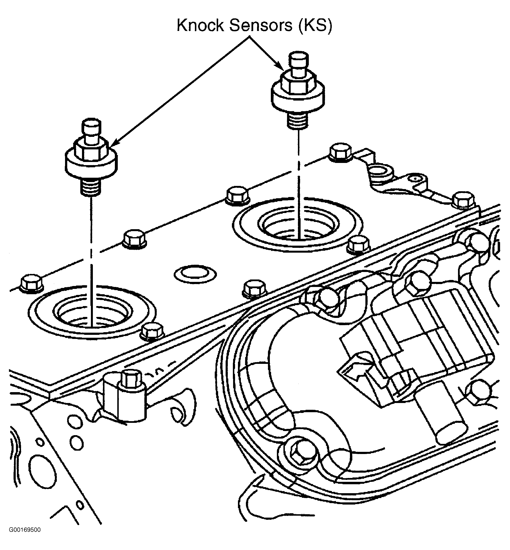The Knock Sensor (KS) produces an AC voltage at all engine speeds and loads. KS is located on top rear of engine. See Fig 1. The PCM then adjusts the spark timing based on the amplitude and frequency of the KS signal. PCM uses the KS signal to calculate the average voltage. Then PCM assigns a voltage value. PCM checks the knock sensor and related wiring by comparing the actual knock signal to the assigned voltage range. A normal KS signal should stay within the assigned voltage range. A fault in the KS circuit may set a DTC. To diagnose, perform related diagnostic test. See DIAGNOSTIC TROUBLE CODE DEFINITIONS in SELF-DIAGNOSTICS - 4.8L, 5.3L & 6.0L "C", "K" & "N" SERIES - FLEX FUEL & GASOLINE article. When a related DTC is not present and the KS system is the suspected cause of a driveability problem, check of KS system. See SYMPTOMS in SYSTEM & COMPONENT TESTING - 4.8L, 5.3L & 6.0L "C", "G", "H", "K" & "N" SERIES- FLEX FUEL & GASOLINE article.