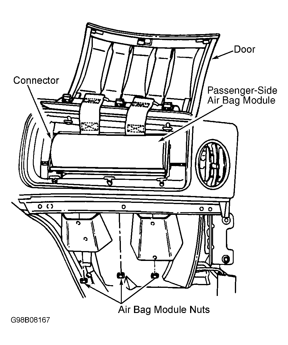 - Release retaining clips and remove right lower instrument panel finish panel. Remove bolts and remove right lower instrument panel finish panel reinforcement and reinforcement mounting bracket. Locate and disconnect the passenger air bag module electrical connector between interior engine cover and passenger air bag module. See Fig 1.
