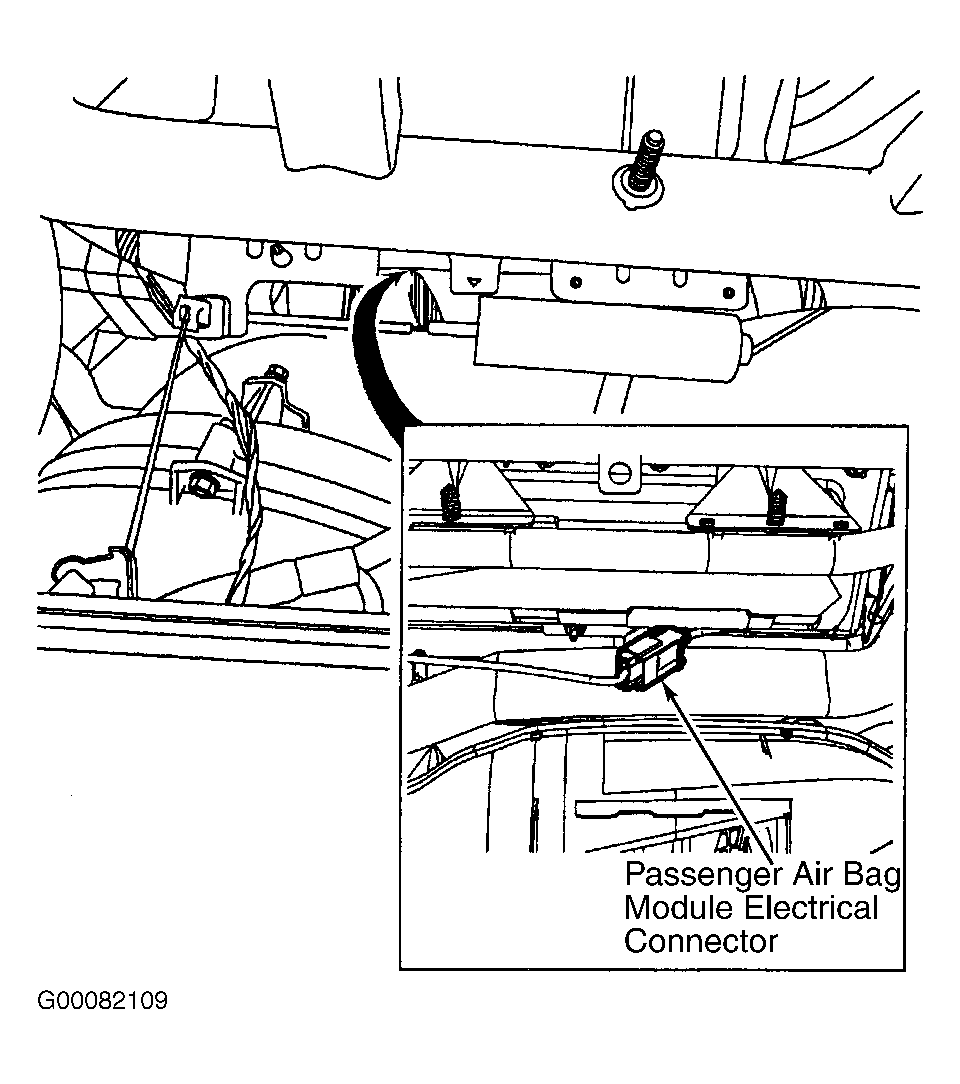 - Remove glove box. See Fig 2. The passenger air bag module electrical connector is located in front of the cross-car beam attached by a pin-type retainer to a bracket on the back of the passenger air bag module. See Fig 3. Disconnect passenger side air bag module electrical connector. Connect appropriate air bag simulator to vehicle harness (in place of air bag). See AIR BAG SIMULATOR .