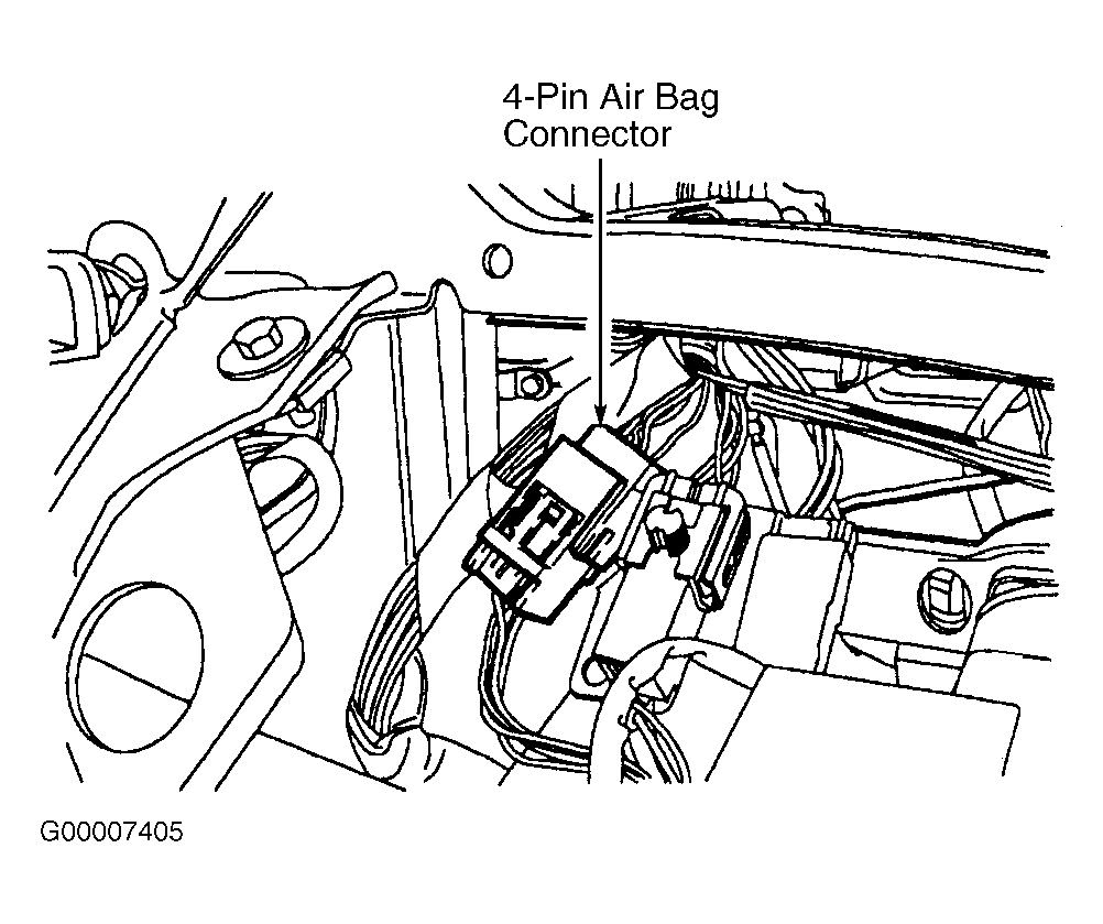 2. Remove lower steering column cover. Disconnect 4-pin driver air bag connector at base of steering column. See Fig 1. Connect appropriate air bag simulator (in place of air bag). See AIR BAG SIMULATOR .