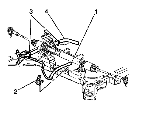 11. Install the retainer clips (3) retaining power steering line (4) along engine frame rail.