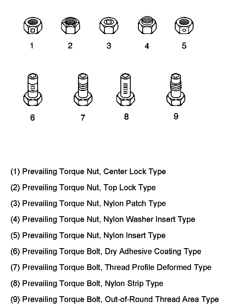 These fasteners accomplish the thread interface by the presence of a thread-locking compound on the fastener threads. Refer to the appropriate repair procedure in order to determine if the fastener may be reused and the applicable thread-locking compound to apply to the fastener.
