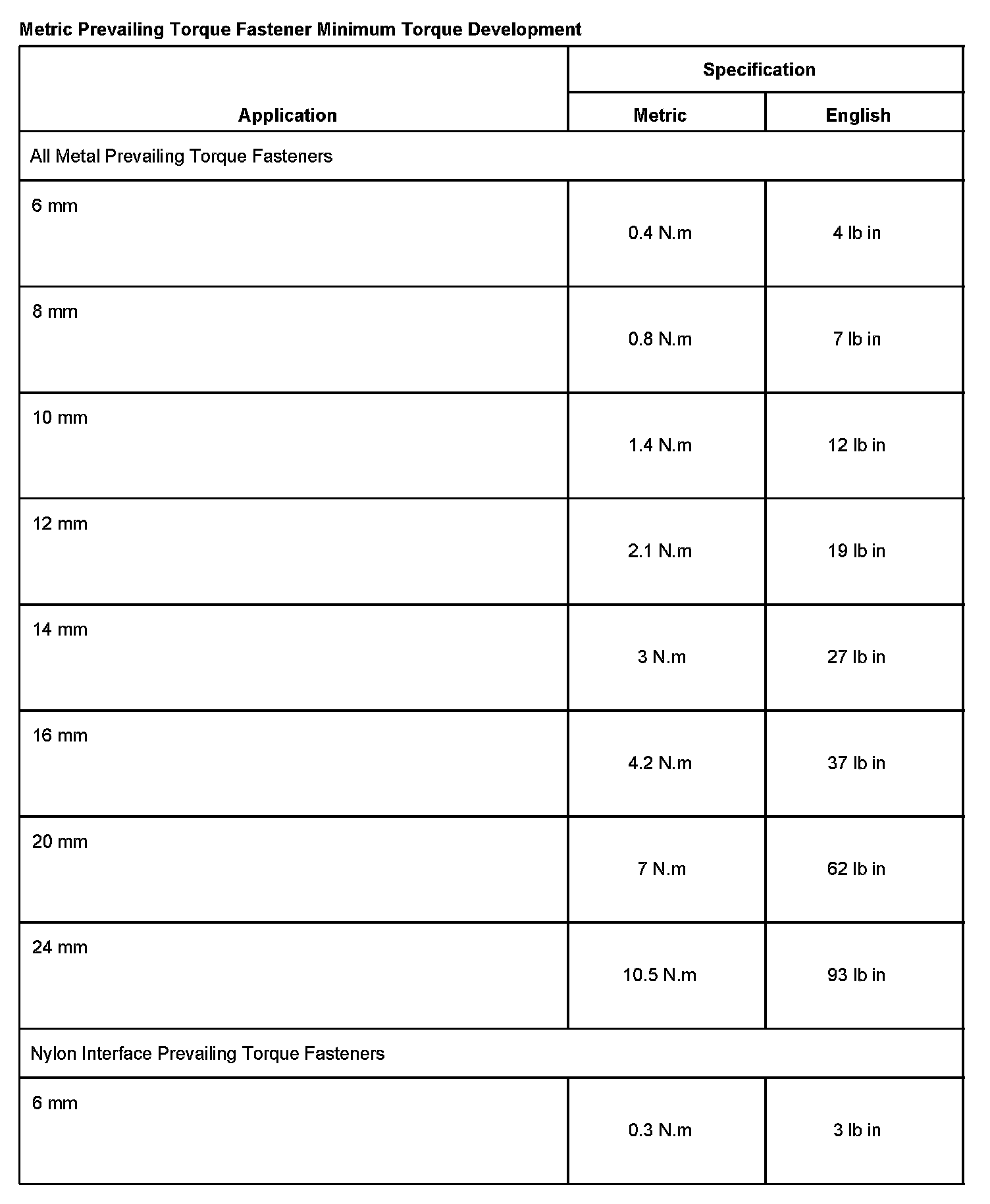 METRIC PREVAILING TORQUE FASTENER MINIMUM TORQUE DEVELOPMENT