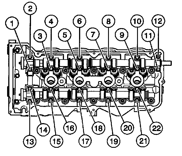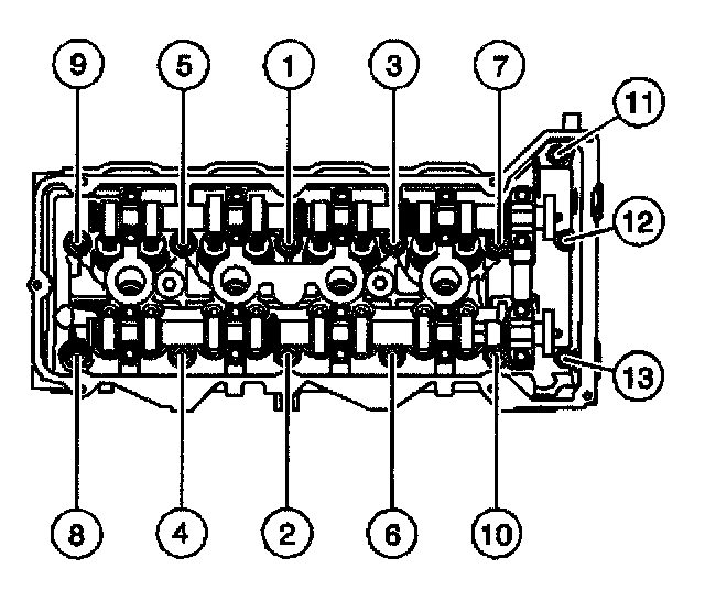 Tighten the left cylinder head M11 cylinder head bolts to 40 Nm (30 lb ft) in the sequence shown.