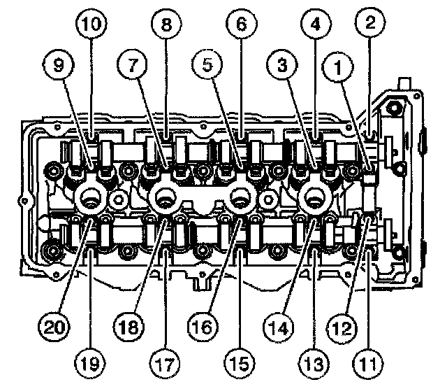 Tighten the lower crankcase bearing bolts (1 through 20) to 20 Nm (15 lb ft) in the proper sequence.