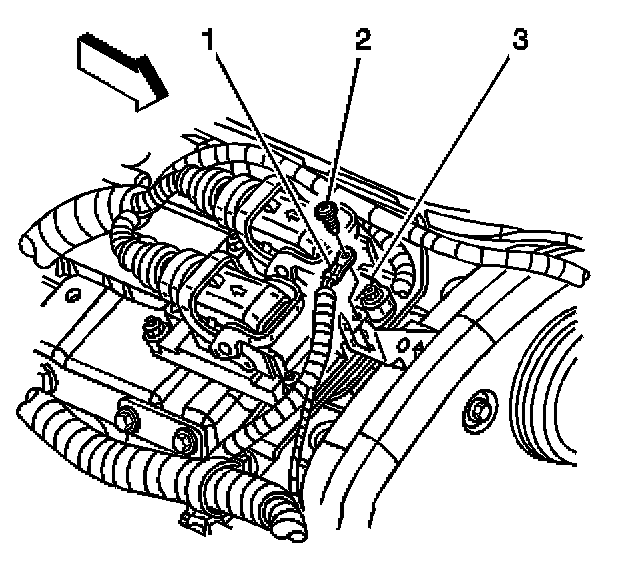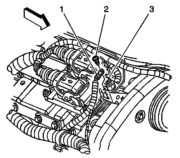 2. Remove the screw (2) securing the engine control module (ECM) ground wire (1) to the ECM (3).