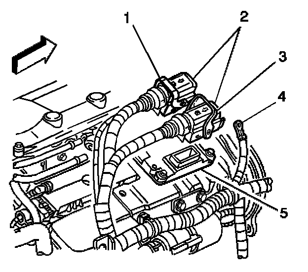 3. Flip the release levers to the open position (3) and disconnect the ECM connectors (2) from the ECM (5).