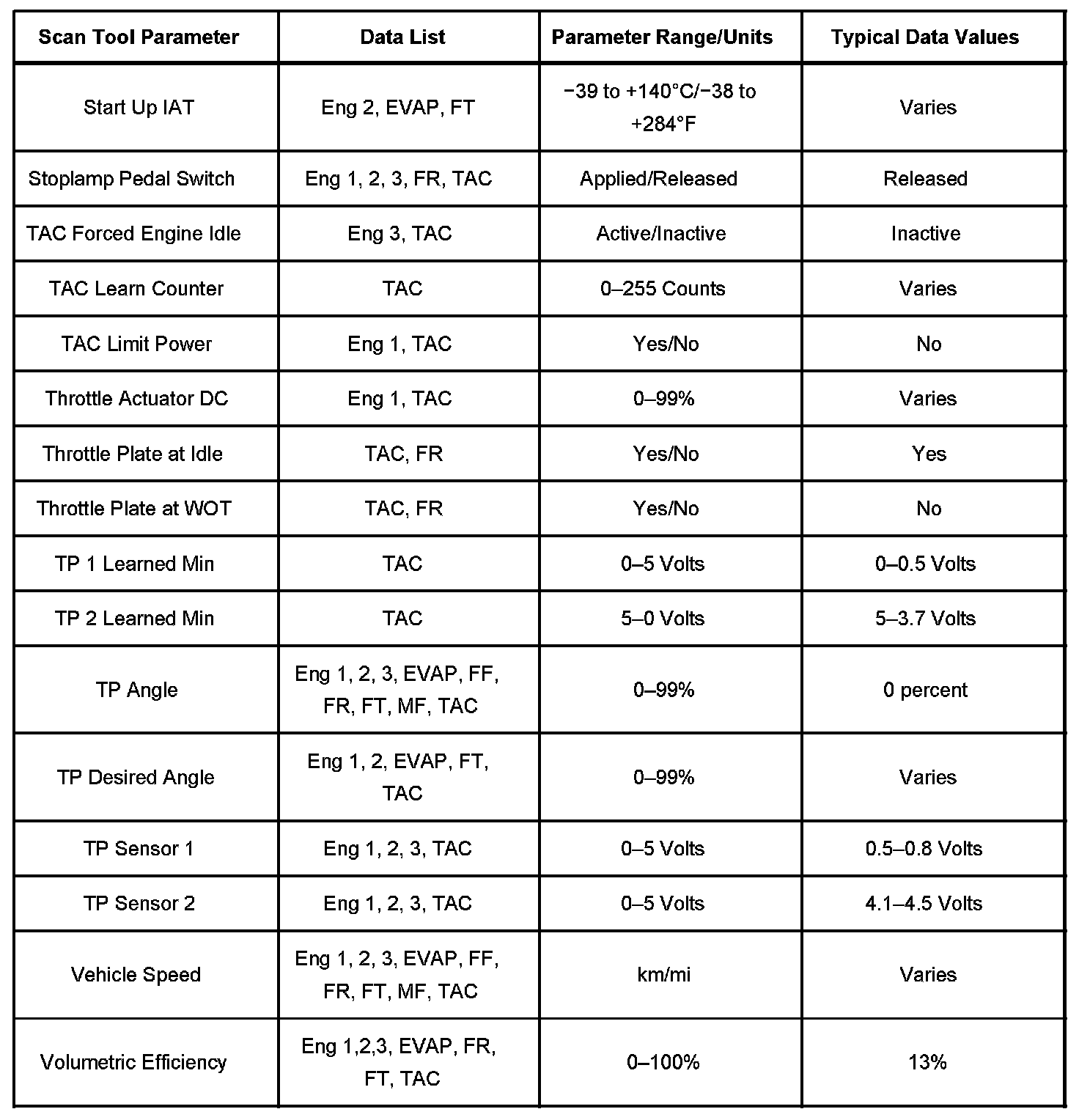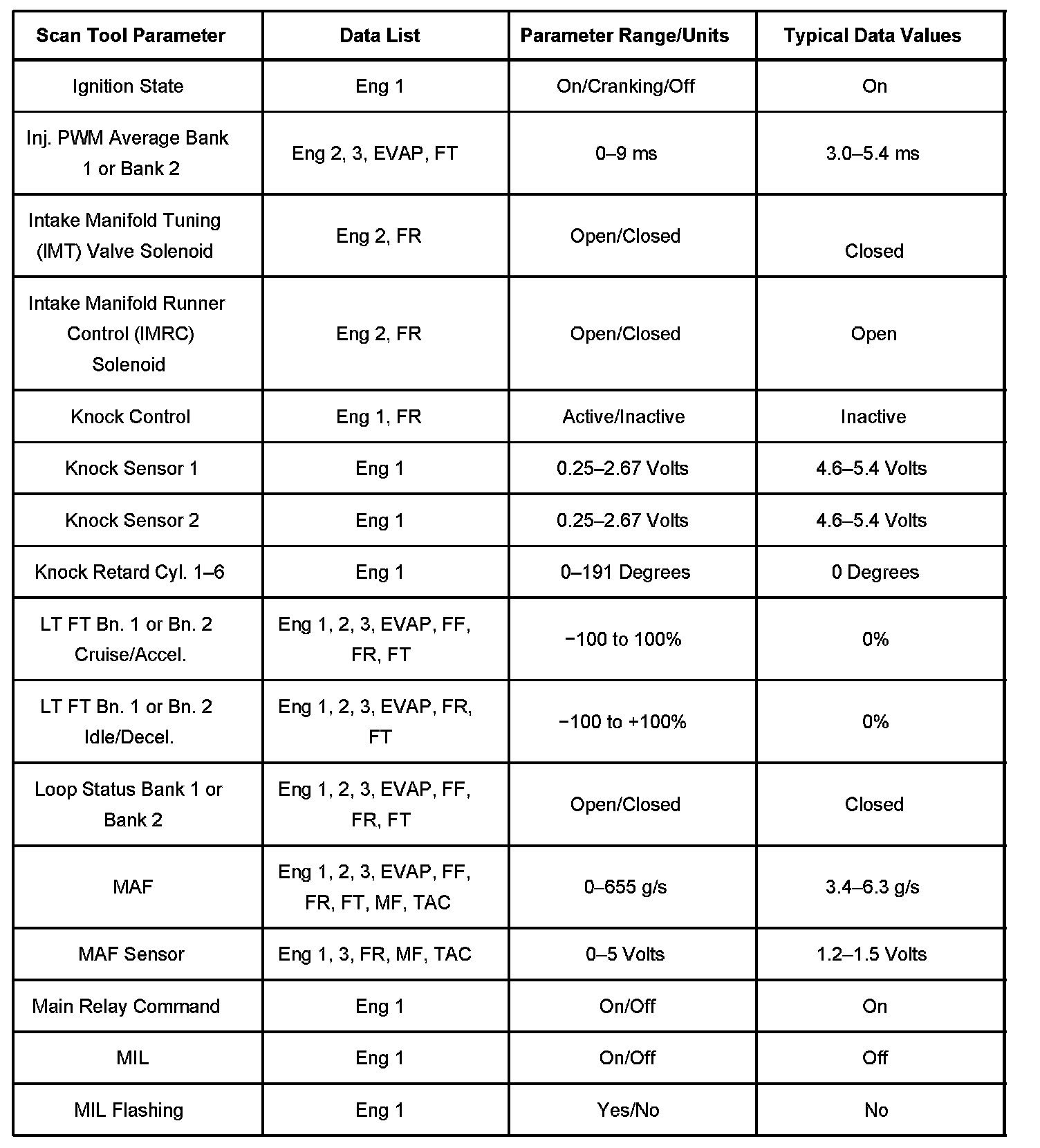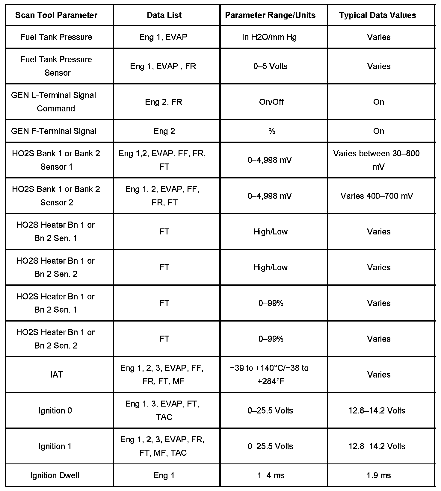 The Engine Scan Tool Data List contains all engine related parameters that are available on the scan tool. The list is arranged in alphabetical order. A parameter may appear in any one of the data lists, and in some cases may appear more than once, or in more than one data list in order to group certain related parameters together.