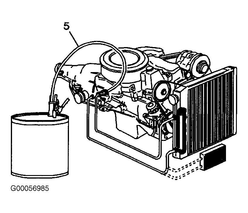 3. Start the engine with the transaxle in PARK range and run for 30 seconds. A minimum of 2 qts. (1.9L) must be discharged during this 30 second run time. If fluid flow is greater than 2 qts. (1.9L) in 30 seconds, go to step  4 . If fluid flow is less than 2 qts. (1.9L) in 30 seconds, perform the following diagnosis. Disconnect the oil cooler feed line at the radiator. Connect the discharge hose (5) to the cooler feed line. Clip the discharge hose (5) to the empty oil drain container. See Figure . Start the engine with the transaxle in PARK range and run for 30 seconds. A minimum of 2 qts. (1.9L) must be discharged during this 30 second run time. Do the following according to the flow rate: