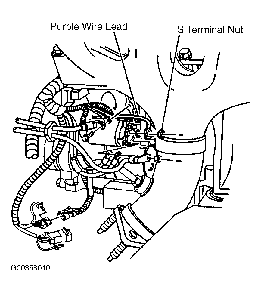 2. Install the starter motor S terminal washer and purple lead wire. See Figure . Install the S terminal nut. Tighten the S terminal nut to specifications. See TORQUE SPECIFICATIONS  .