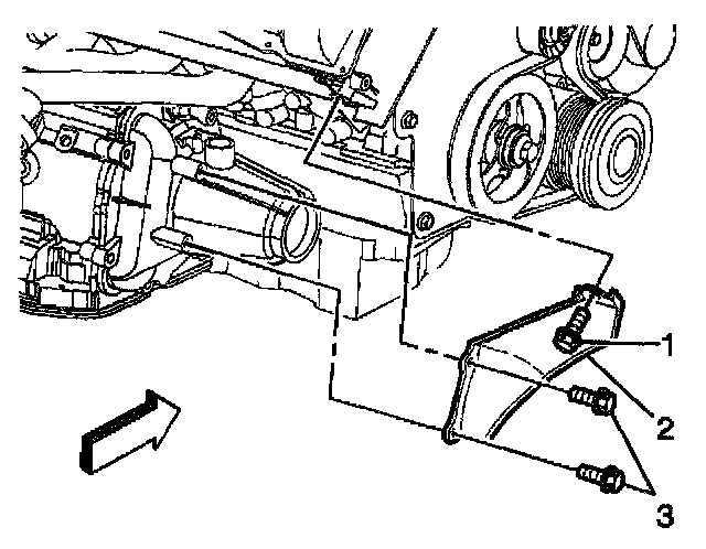 2. Remove the bolts (1, 3) securing the front transaxle brace (2) to the transaxle and right cylinder head.