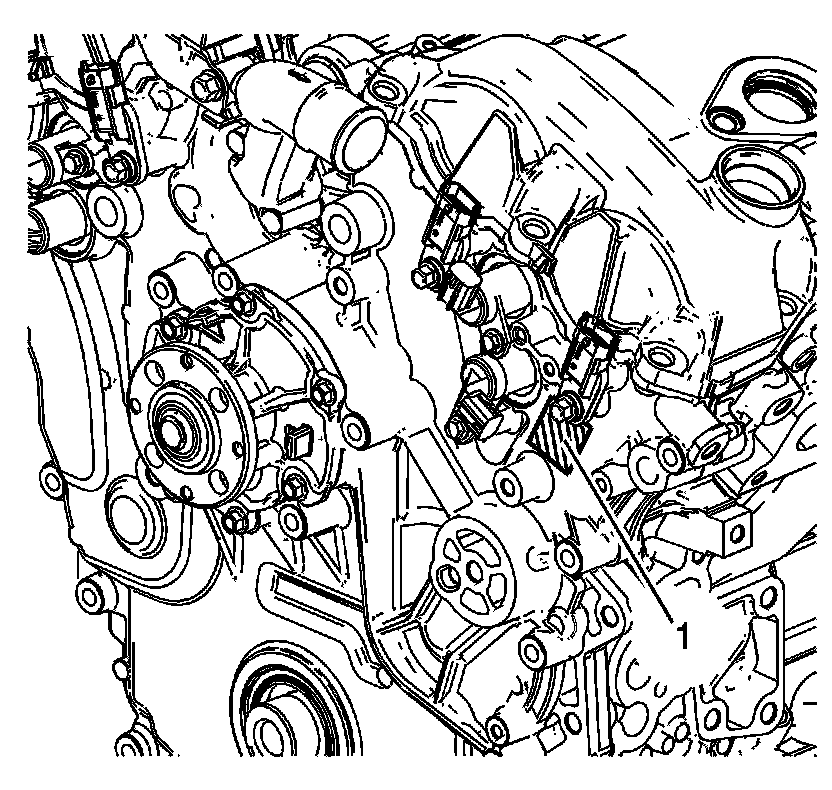 One engine verification label (1) is located on the left side of the engine front cover below the exhaust camshaft position sensor.