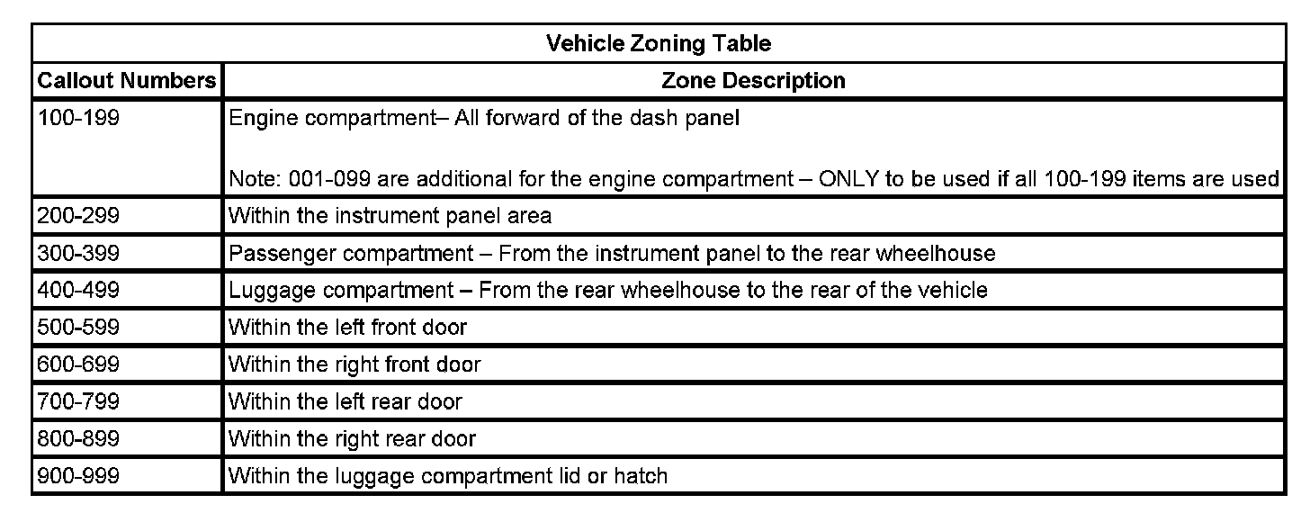 All grounds, in-line connectors, pass-through grommets, and splices have identifying numbers that correspond to where they are located in the vehicle. The following table explains the numbering system.