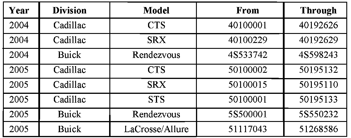 All 2004 Cadillac CTS, SRX; Buick Rendezvous and certain 2005 Cadillac CTS, SRX, STS; Buick Rendezvous, LaCrosse/Allure model vehicles, equipped with a 3.6L V6 (RPO LY7 - VIN 7) or 2.8L V6 RPO LP1 - VIN T) engine, and built within the VIN breakpoints shown.