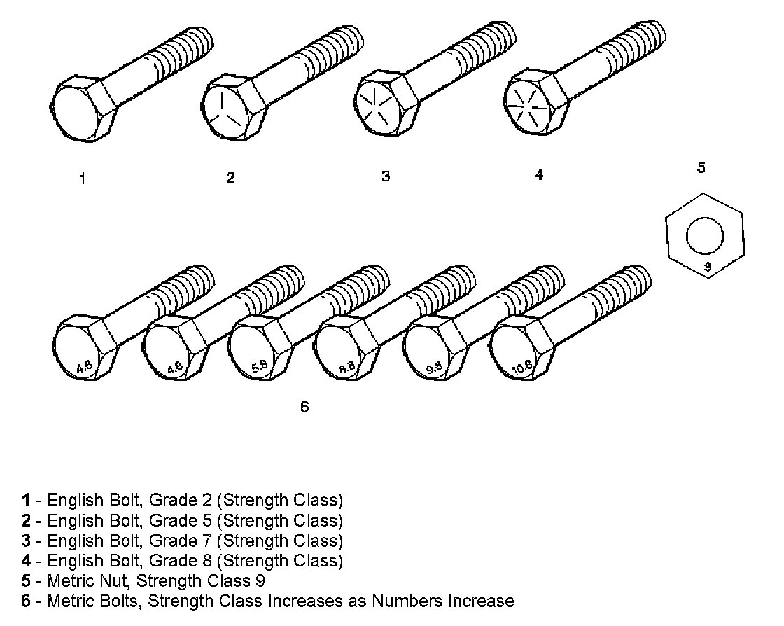 The most commonly used metric fastener strength property classes are 9.8 and 10.9. The class identification is embossed on the head of each bolt. The English, inch strength classes range from grade 2 to grade 8. Radial lines are embossed on the head of each bolt in order to identify the strength class. The number of lines on the head of the bolt is 2 lines less than the actual grade. For example, a grade 8 bolt will have 6 radial lines on the bolt head. Some metric nuts are marked with a single digit strength identification number on the nut face.