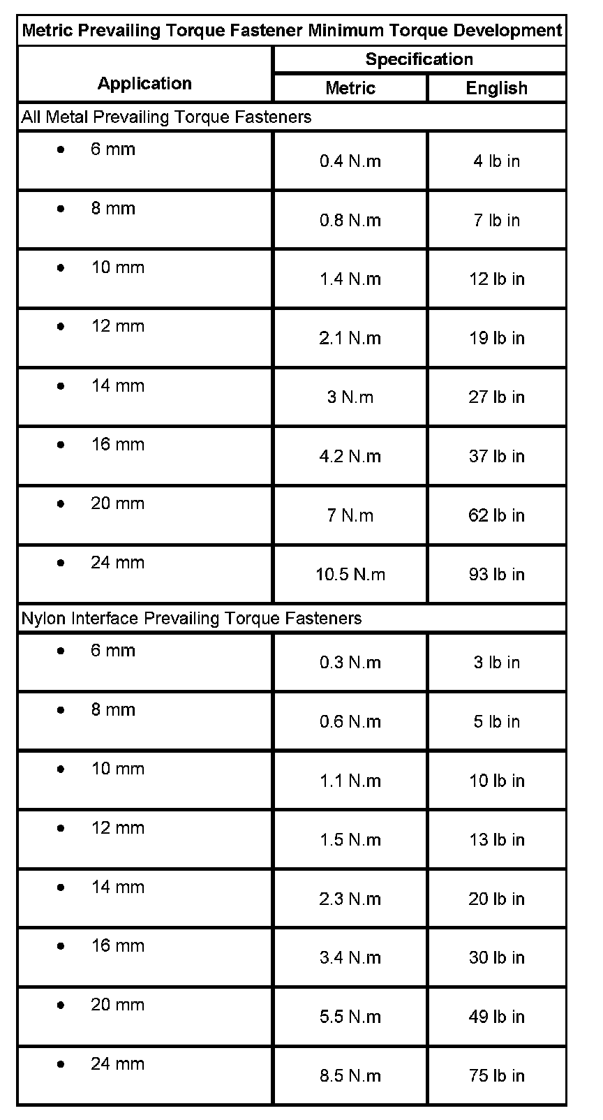 Metric Prevailing Torque Fastener Minimum Torque Development: