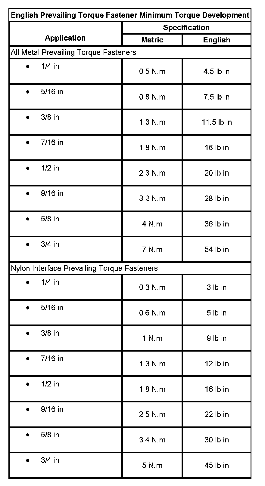 ENGLISH PREVAILING TORQUE FASTENER MINIMUM TORQUE DEVELOPMENT