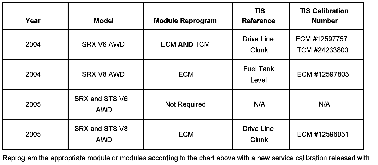 ^ The 2004 SRX AWD V8 requires reprogramming of ONLY ECM calibration. The TIS screen will reference a revised fuel tank level diagnostic which does contain the driveline clunk concern calibration fix.