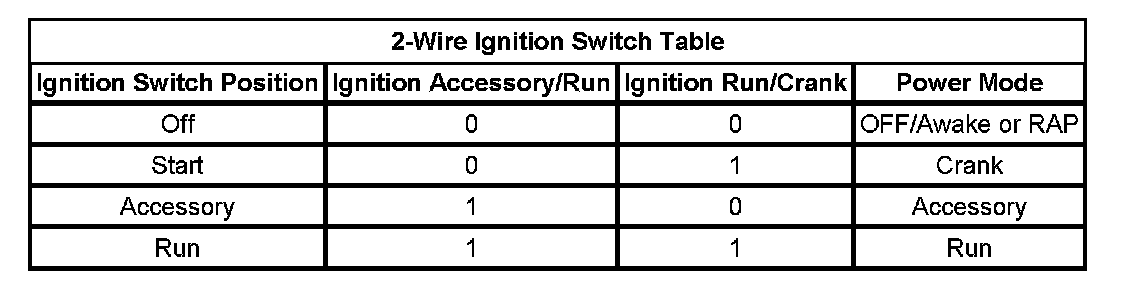 Those modules that have discrete ignition signal inputs also remain in the state dictated by the last valid PMM message received on the serial data circuits. They then check the state of their discrete ignition input to determine the current valid state. If the discrete ignition input is active, battery positive voltage, the modules will fail-safe to the RUN power mode. If the discrete ignition input is not active, open or 0 voltage, the modules will fail-safe to OFF-AWAKE. In this state the modules are constantly checking for a change status message on the serial data circuits and can respond to both local inputs and serial data inputs from other modules on the vehicle.