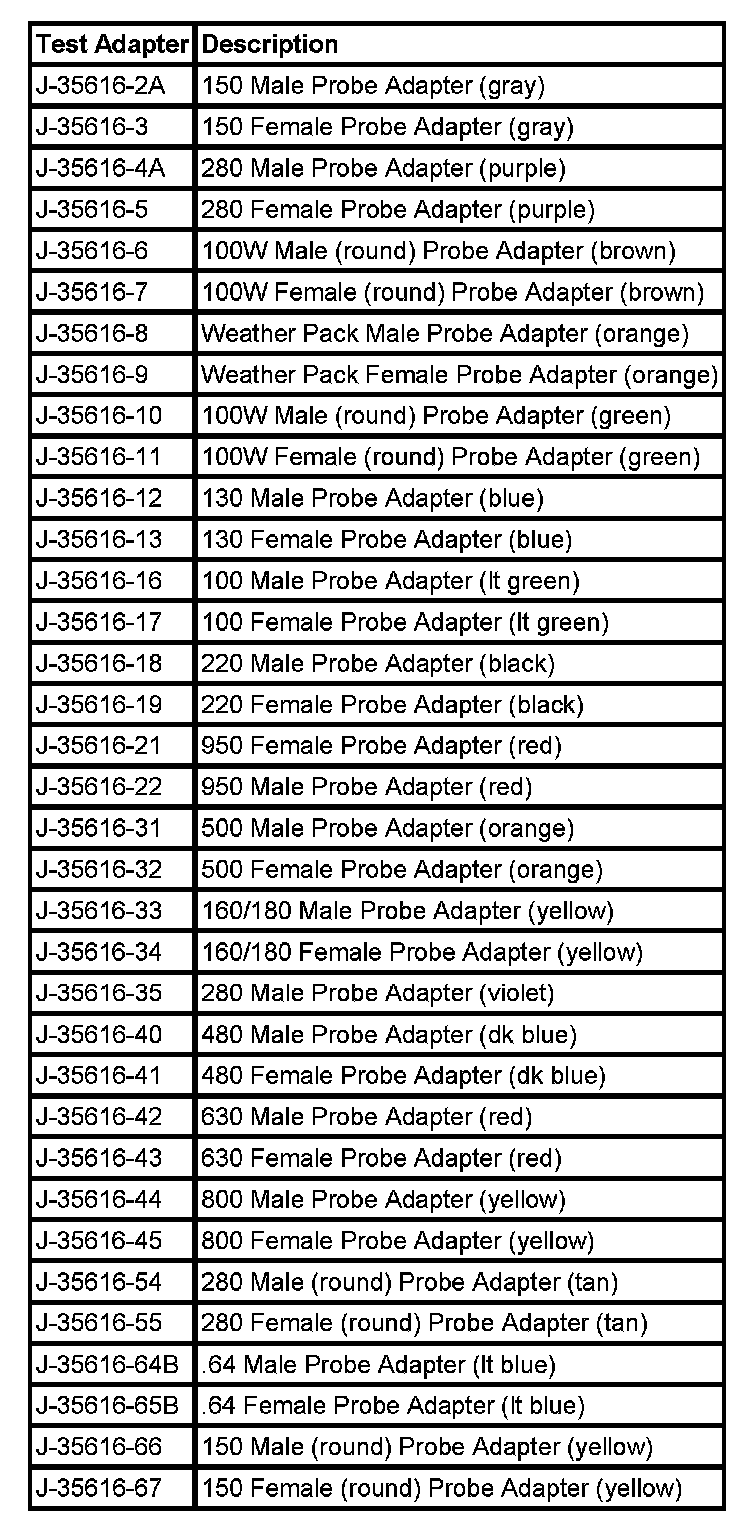 NOTE: Do not insert test equipment probes (DVOM etc.) into any connector or fuse block terminal. The diameter of the test probes will deform most terminals. A deformed terminal will cause a poor connection, which will result in a system failure. Always use the J-35616 GM-Approved Terminal Test Kit in order to front probe terminals. Do not use paper clips or other substitutes to probe terminals.