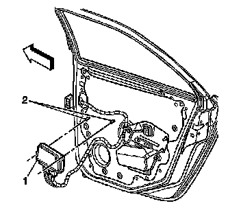 2. Remove the door control module (1) by releasing the retainer tabs (2).