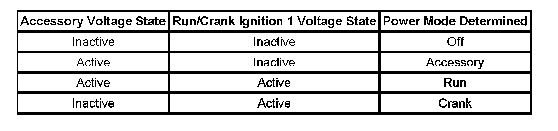 On vehicles that have several control modules connected by serial data circuits, one module is the power mode master (PMM). On this vehicle the PMM is the instrument panel module (IPM). The IPM will monitor the ignition mode switch only with battery voltage above 7 volts to prevent invalid input readings during low voltages encountered during vehicle cranking. If the ignition mode switch input or the battery voltage input changes, a ratio metric calculation of ignition mode switch input value is performed. The IPM discerns the following states over the ignition mode switch signal circuits: