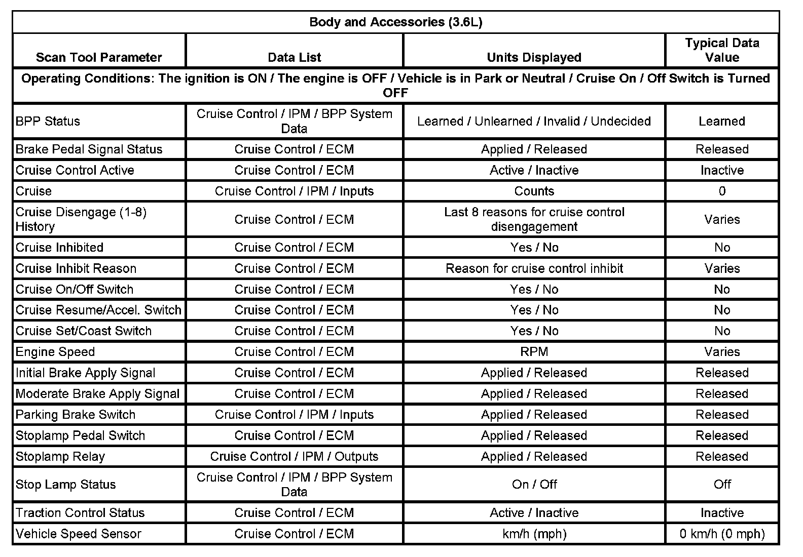 The scan tool data lists contain all of the cruise control related parameters that are available on the scan tool for the Cruise Control System. The parameters in the list are arranged in alphabetical order. The data list column indicates the location of the parameter within the scan tool menu selections.