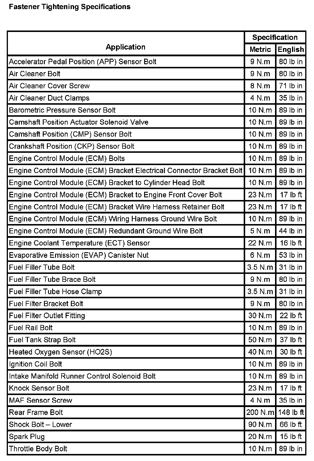 Fastener Tightening Specifications: