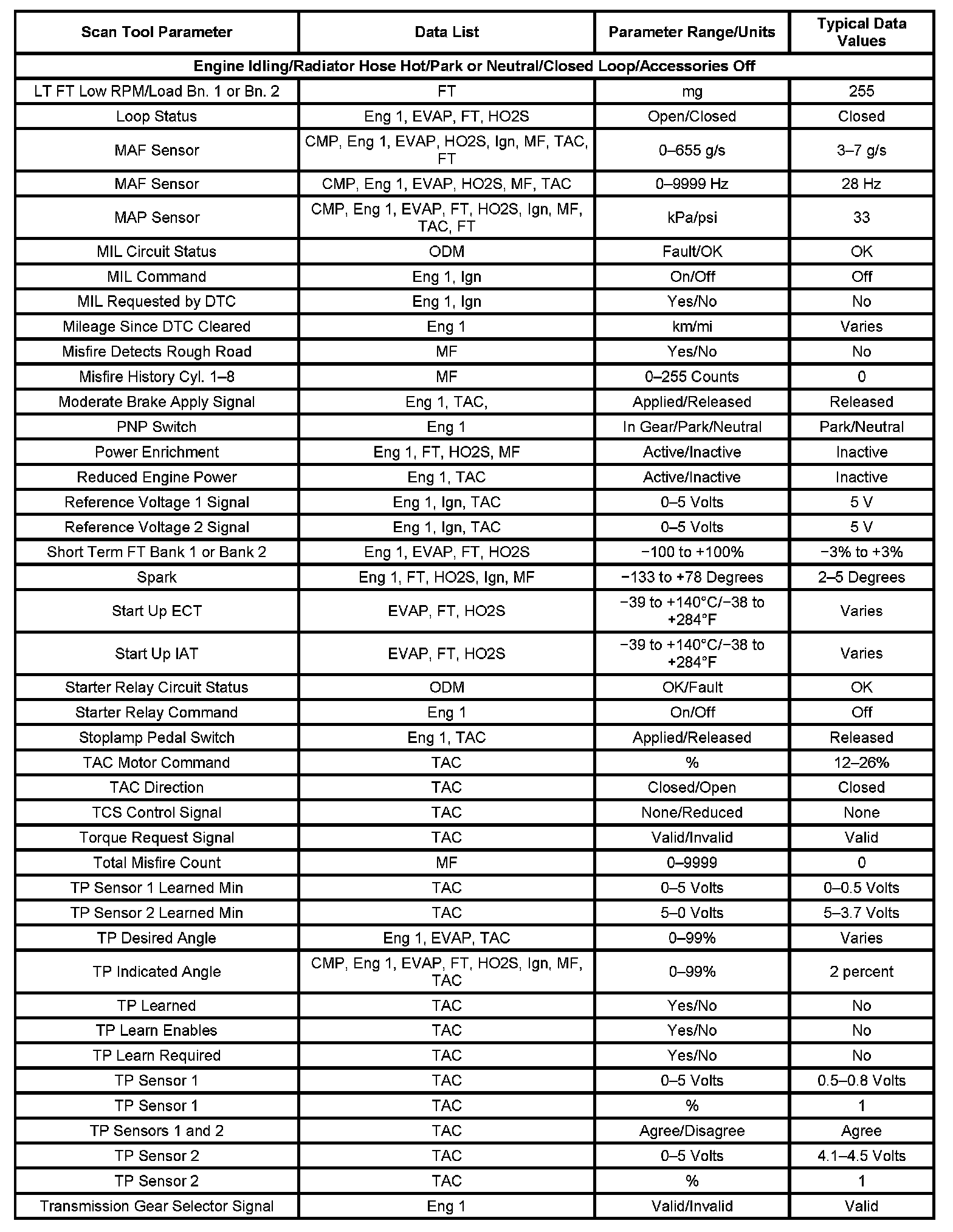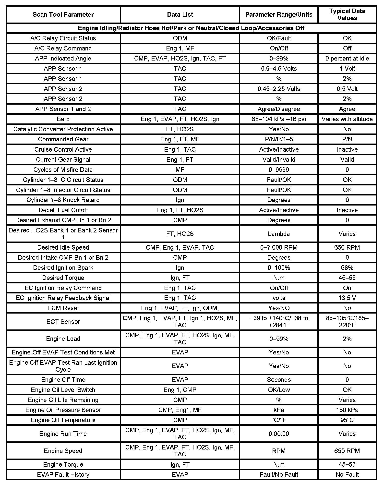 Scan tool values from a properly running engine may be used for comparison with the engine you are diagnosing. The Engine Scan Tool Data List represents the values that would be seen on a normal running engine.