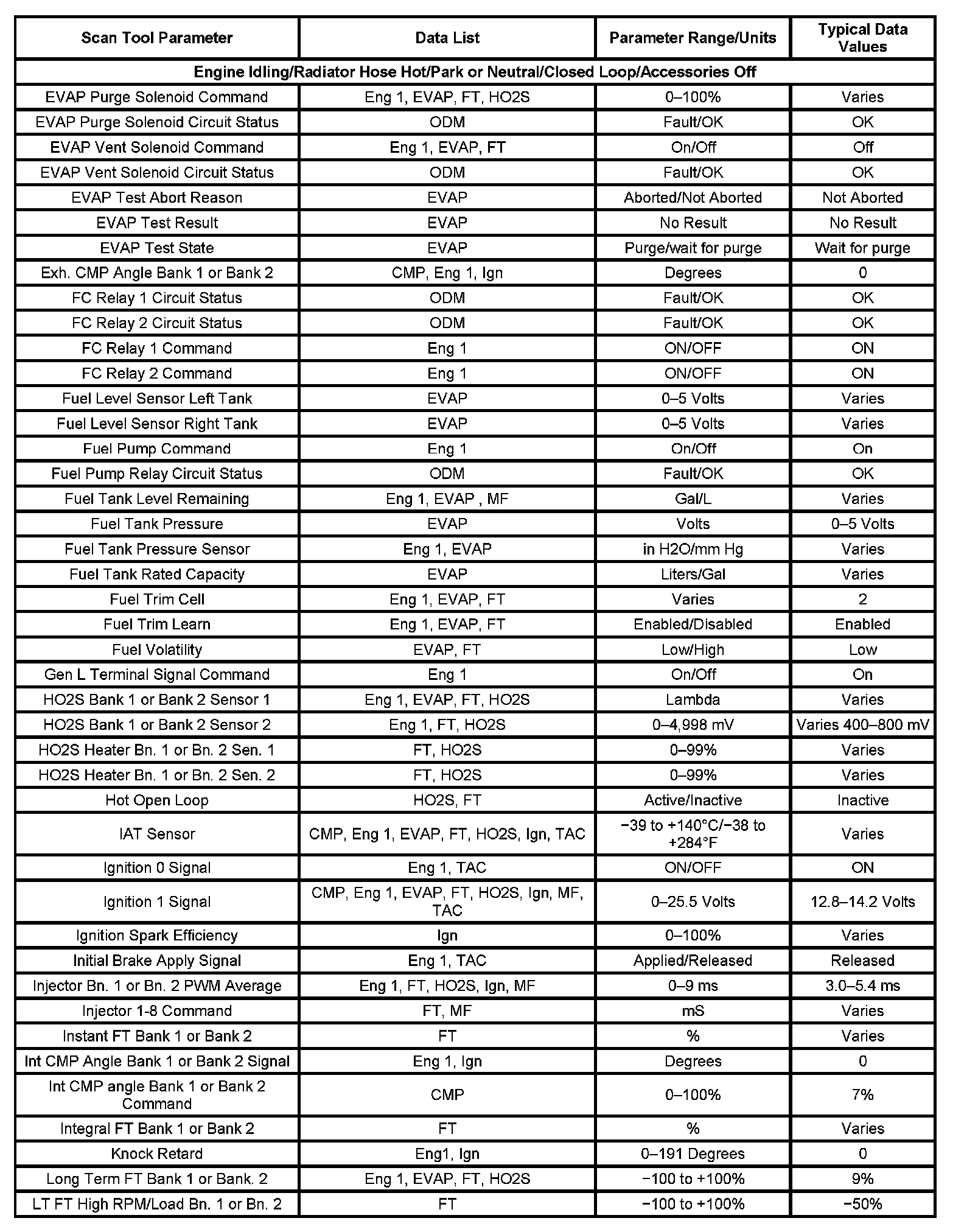 The Engine Scan Tool Data List contains all engine related parameters that are available on the scan tool. The list is arranged in alphabetical order. A parameter may appear in any one of the data lists, and in some cases may appear more than once, or in more than one data list in order to group certain related parameters together.
