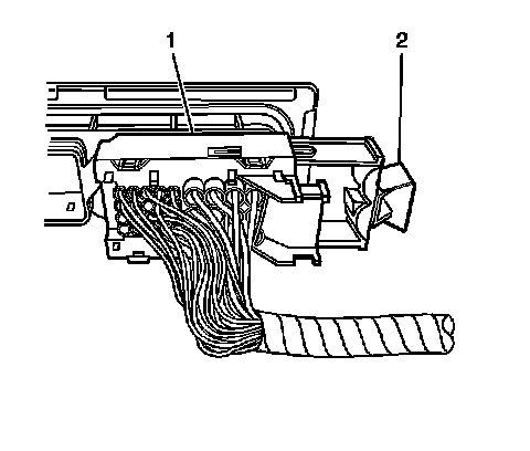 1. Unlock the transmission control module electrical connector by pulling the retainer (2) away from the electrical connector (1).