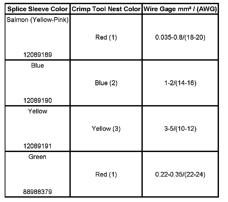 4. Select the proper DuraSeal splice sleeve according to the wire size. Refer to the above table at the beginning of the repair procedure for the color coding of the DuraSeal splice sleeves and the crimp tool nests.