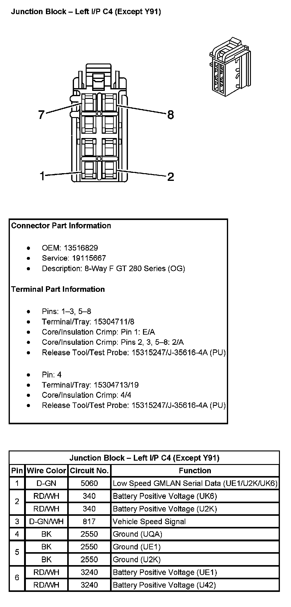 Junction Block - Left I/P C4 (Except RPO Code Y91) (Pin 7 To 8):
