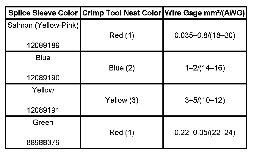 6. Select the proper DuraSeal splice sleeve according to the wire size. Refer to the above table at the beginning of the repair procedure for the color coding of the DuraSeal splice sleeves and the crimp tool nests.
